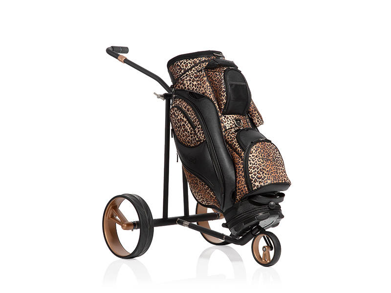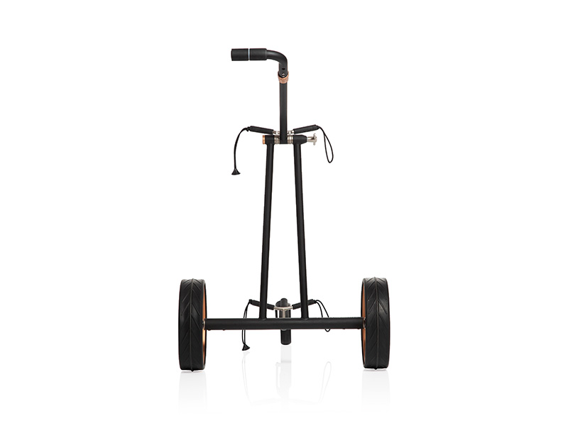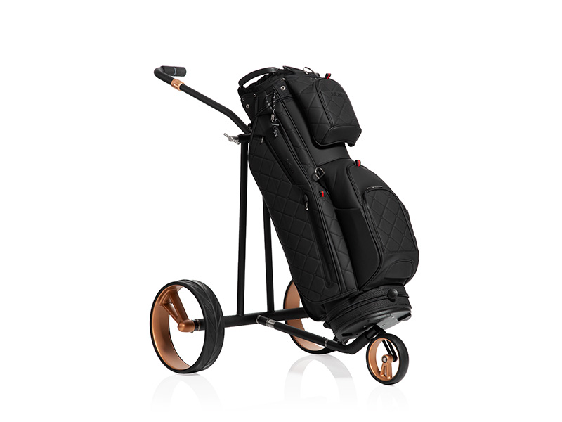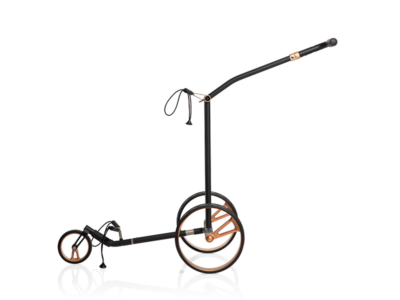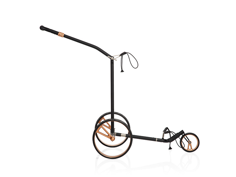 Matná černá se snoubí s růžovým zlatem – projev elegance a síly. Díky vznešené matně černé barvě s jemnými lesklými detaily v růžově zlatém provedení ztělesňuje tento elektrický vozík z titanu čistou exkluzivitu. Jeho celokarbonové jednopaprskové ráfky kloužou po fairwayích jako přízrak – luxusní barevná kompozice matné sytě černé a jemného růžového zlata vytváří hru světla a stínu, která dokonale spojuje decentnost a extravaganci. Designový vozík se dodává v extra ploché tašce na přenášení se samostatným sáčkem na kola.