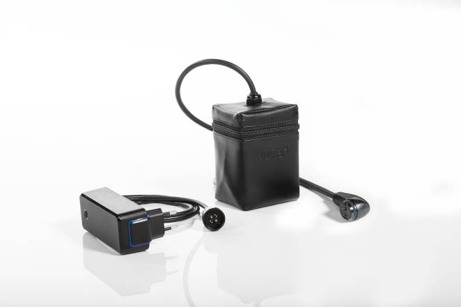 - Posición cómoda del conector del JuCad Powerpack, con enchufe magnético para una conexión rápida y segura al carro y al cargador.